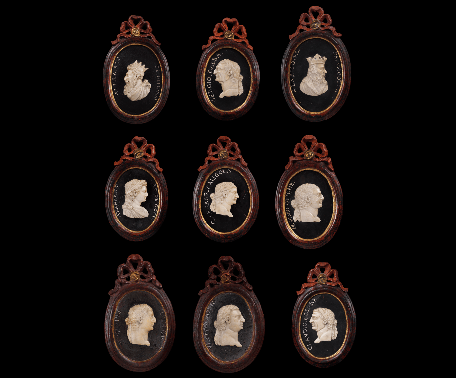 Each plaque bears the name of the figure depicted. Original wooden frames in red, black, and gold lacquer each surmonted by a tied ribbon.