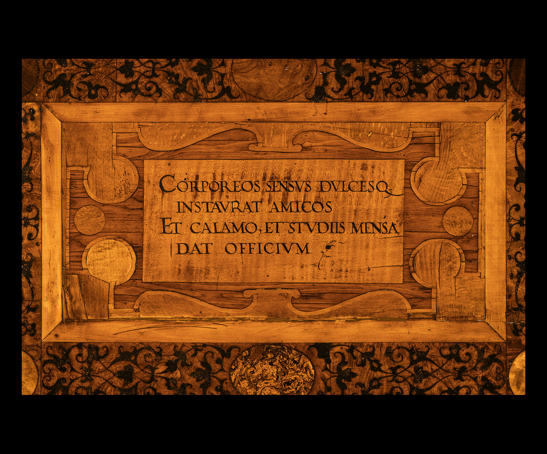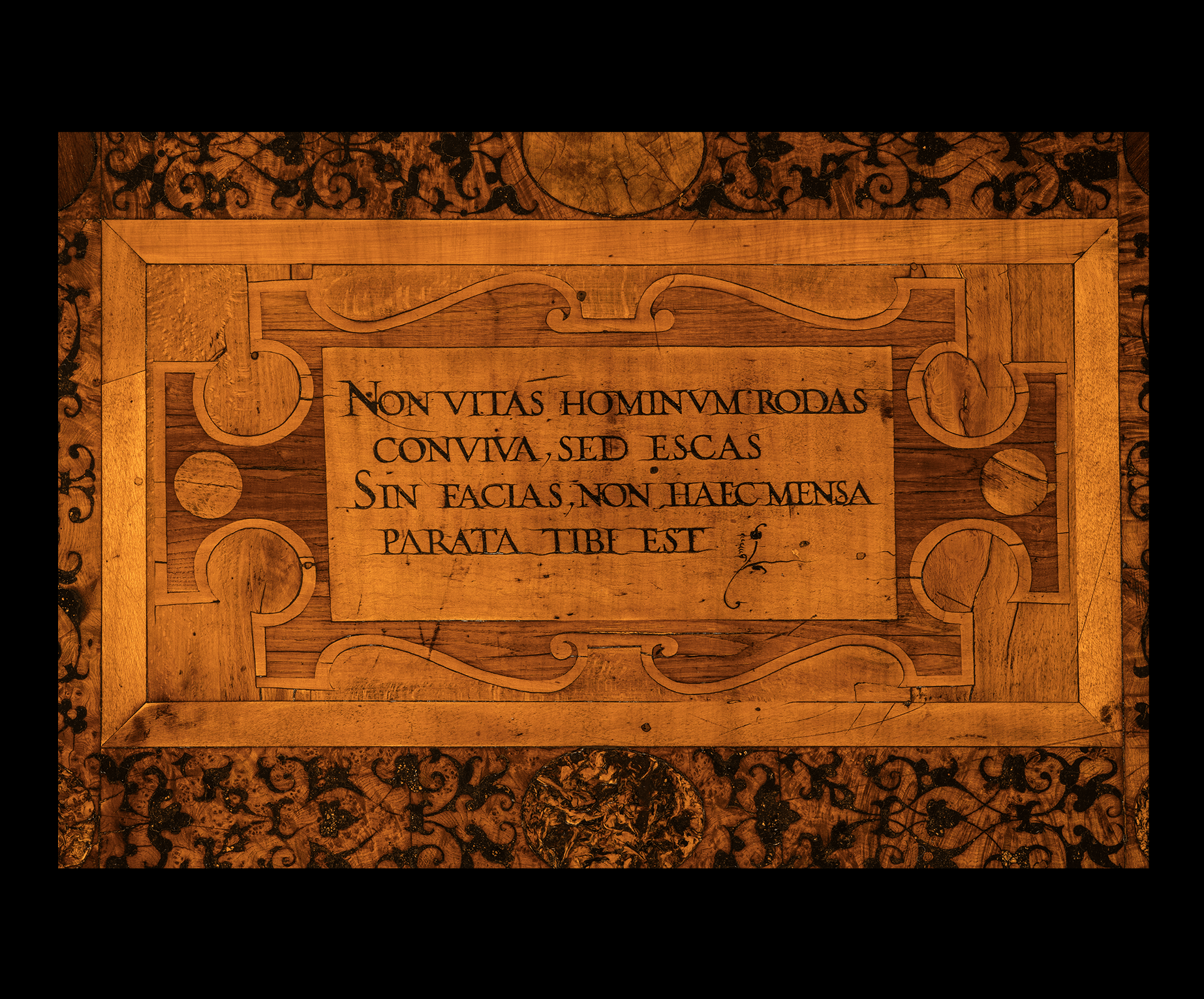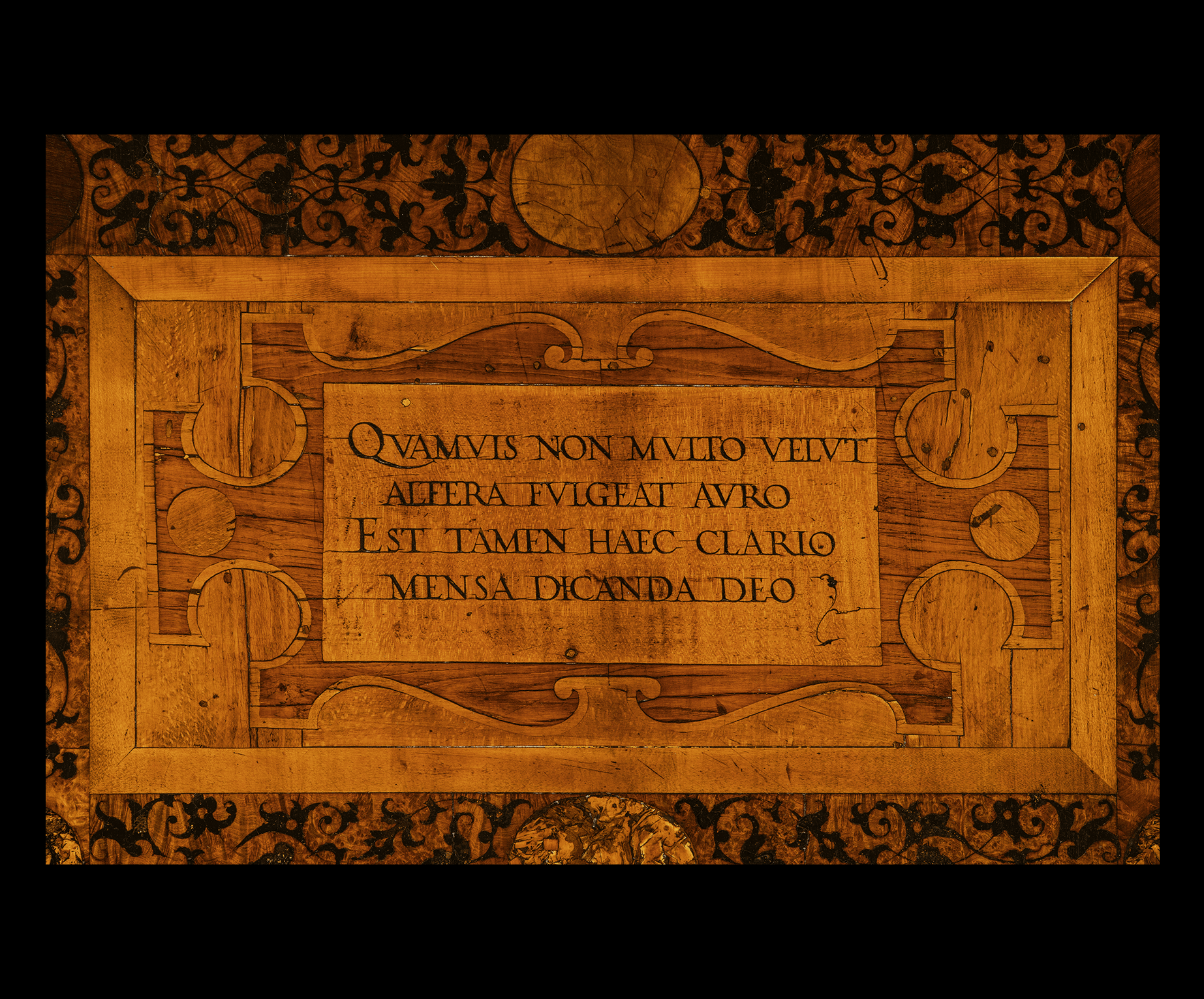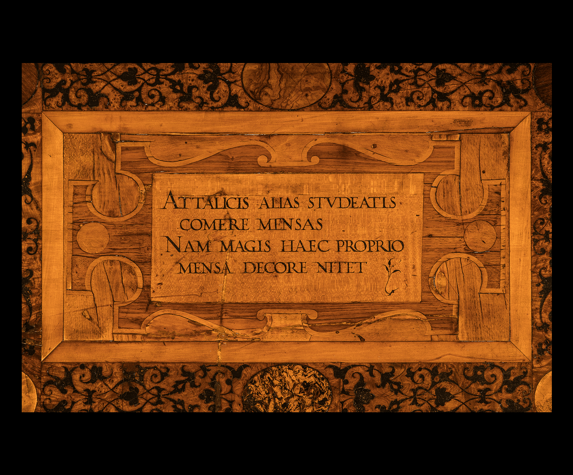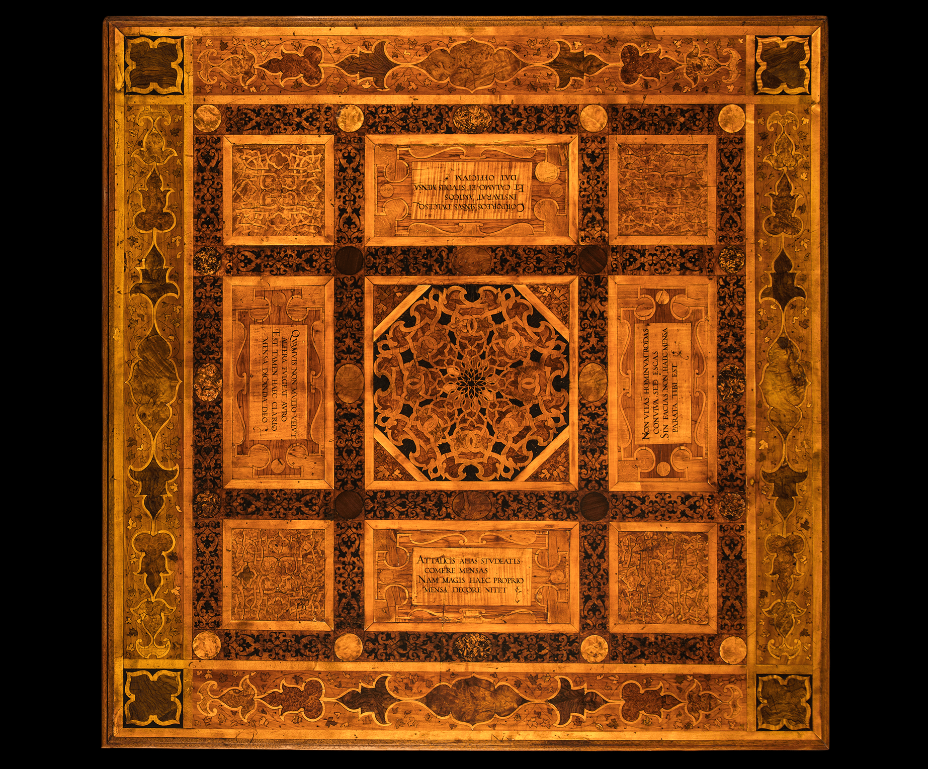Elm, beech, maple, walnut, ebonised oak and various root-woods inlaid with brown primer imitating damascening, 130 x 130 cm.